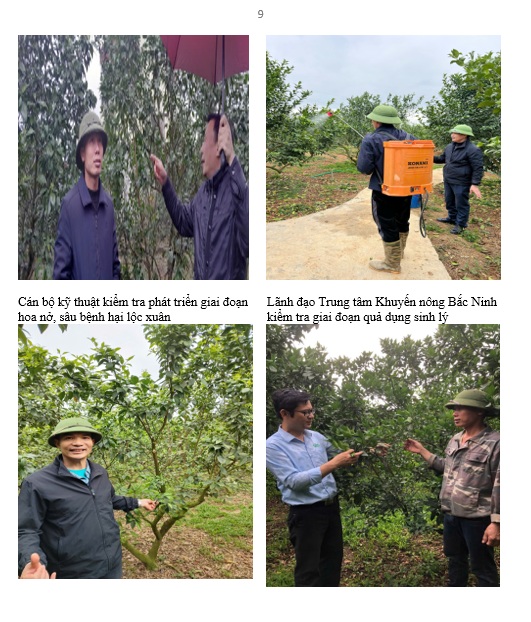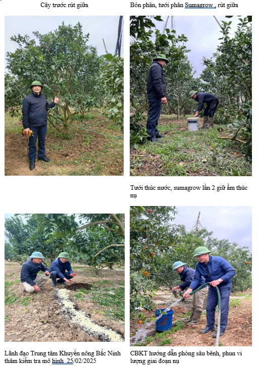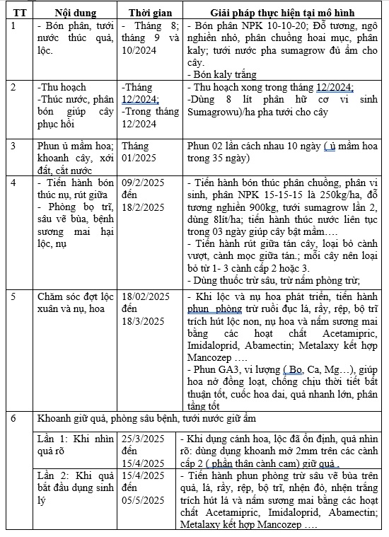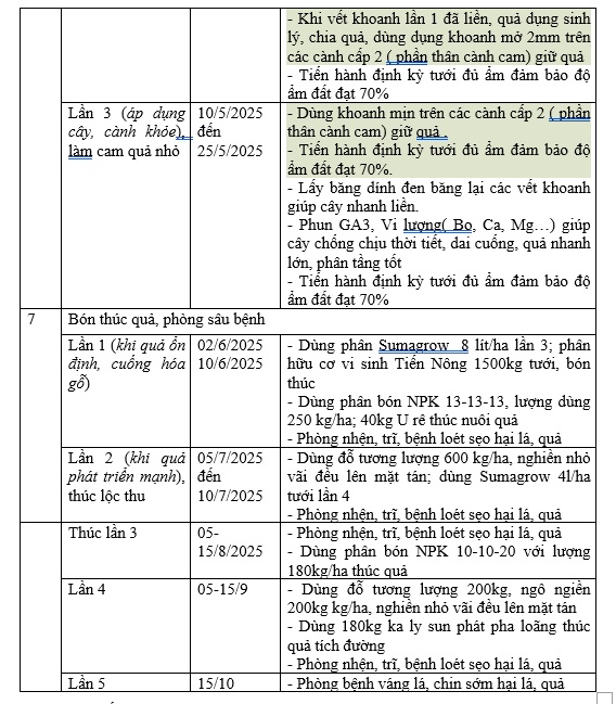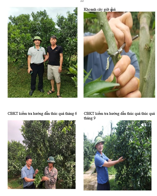 Tư vấn giúp hộ gia đình bón phân cân đối, hợp lý, chủ động điều tra và phòng trừ sâu bệnh giúp vườn cam giữ quả cân đối, hiệu quả, vườn cam ra lộc Xuân, Hè và Thu kịp thời. Chăm sóc cam cuối vụ đúng kỹ thuật, quả cam chín và thu hoạch đồng loạt, đúng thời điểm ( đầu tháng 12), cây có thời gian phục hồi là điều kiện tiên quyết thực hiện chu kỳ áp dụng kỹ thuật ra hoa, đậu quả của năm tiếp sau ( không nghỉ cây).