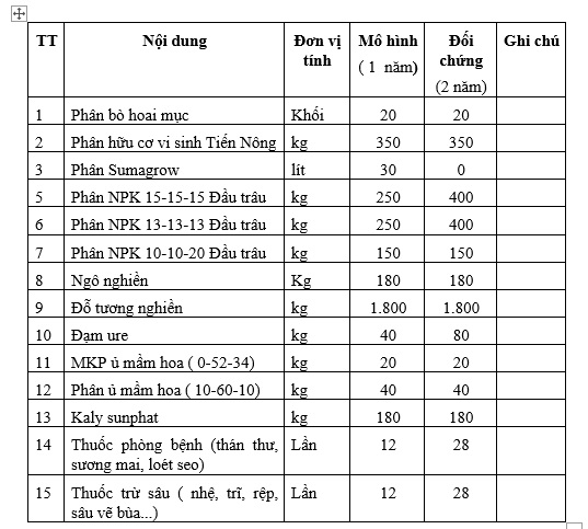 Về số lượng, chủng loại phân bón sử dụng tại mô hình/ha