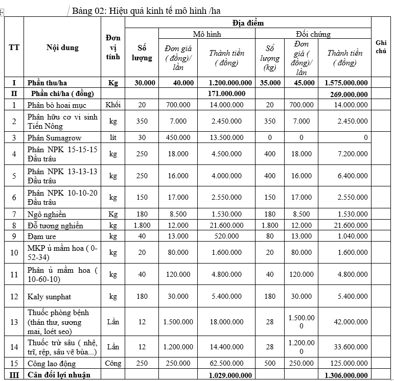 Năng suất dự kiến tại mô hình dự kiến 30 tấn/ha, thấp hơn đối chứng thu quả cách năm ( 02 năm) 5 tấn/ha (35 tấn/ha), mặc dù đều tư 01 năm trên 171 triệu đồng/ha, với đối chức nghỉ năm đầu tư 02 năm là 269 triệu/ ha/02 năm, nhưng lợi nhuận thu được đạt trên 1tỷ đồng/ha/ năm; với mô hình 02 năm đạt 1.3 tỷ lợi nhuận/ha/02 năm.